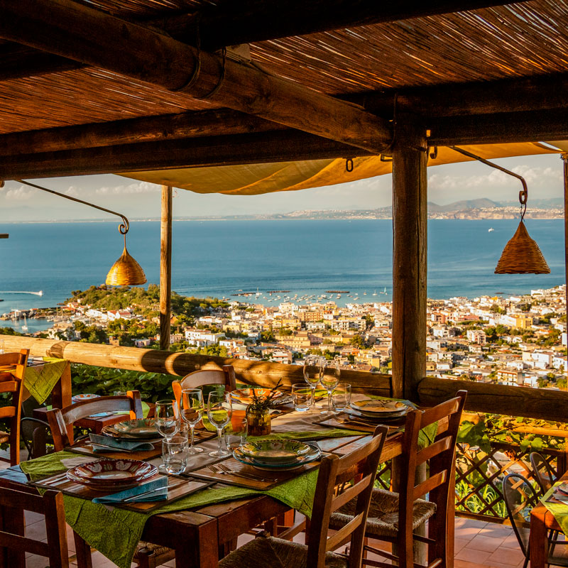 Il ristorante sorge nella parte più alta dell'azienda, un luogo immerso nella natura, dove i sapori del Mediterraneo e della Campania incontrano un’atmosfera intima, autentica e speciale caratterizzata da una vista affascinante.